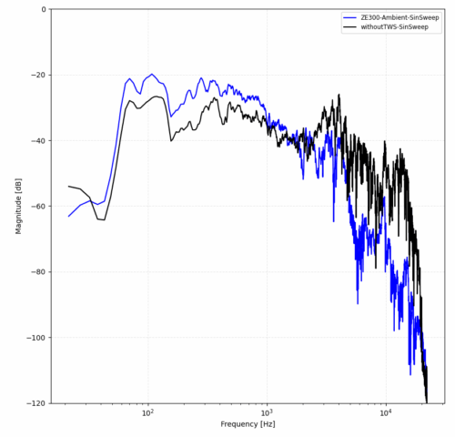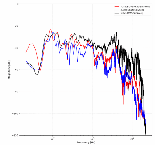 まずはSinSweep信号での検証です。COTSUBU ASMR 3Dはノイズキャンセリング機能無しなので、単に耳栓としての遮音性と比較していきます