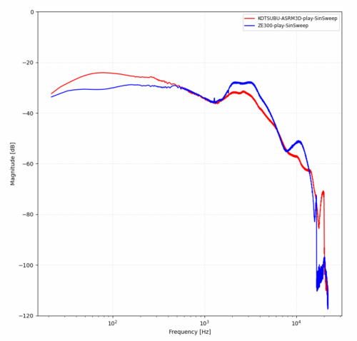 青(ZE300 周波数特性) 赤(COTSUBU ASMR3D 周波数特性)