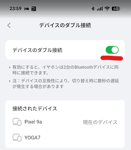 工場出荷時はマルチポイントはオフになっているので、アプリでONにする必要があります。