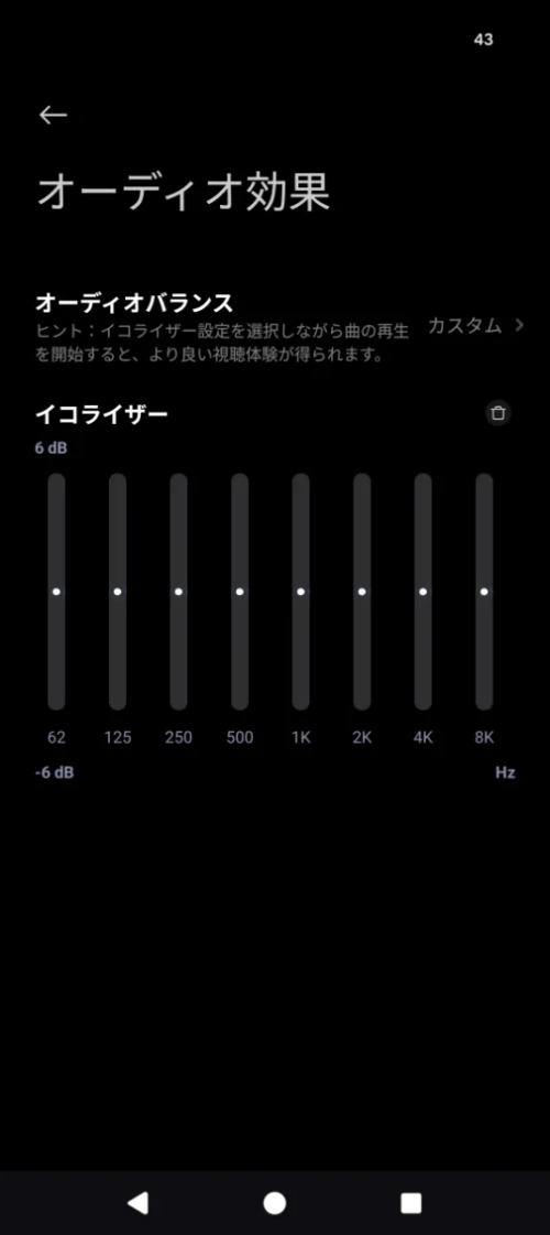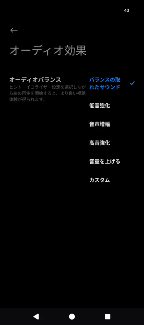 EQプリセットは「標準」「高音強化」「低音強化」「声の強調」「音量ブースト」の5種類。さらにカスタムEQで自分好みに調整もできます。