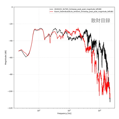 データにもある1k近辺の音だけやけに聞こえるかも? 例えばマウスのカチカチ等は聞こえやすい。